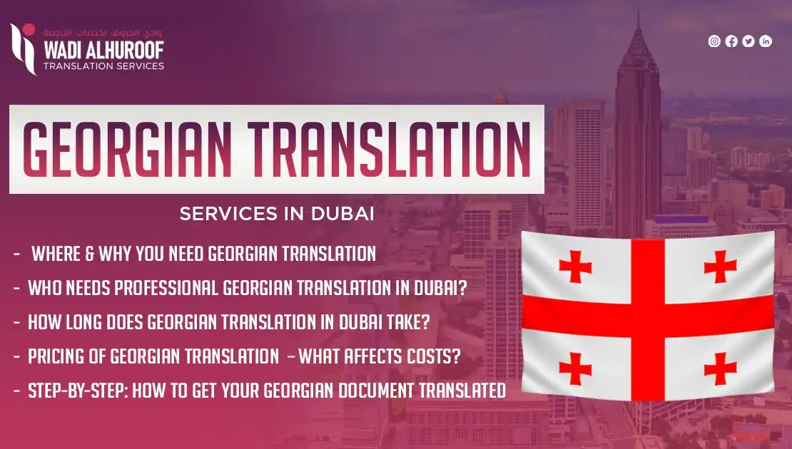 If you’re in search of an efficient Georgian translation in the UAE for legal, immigration academic, corporate or for embassy reasons, Wadi Alhuroof Translation Agency Dubai offers a certified Georgian translation service in Dubai that is in compliance with the requirements from UAE government authorities, and private sector authorities. No matter if you require English to Georgian translation, Georgian to English translation, Georgian to Arabic translation or Arabic to Georgian translation, our skilled linguists guarantee exact and legally recognized results. You can get started easily via WhatsApp +971527969655 or email wadialhuroof@gmail.com. We bridge the language gap between Georgian citizens and UAE companies with expert accuracy.